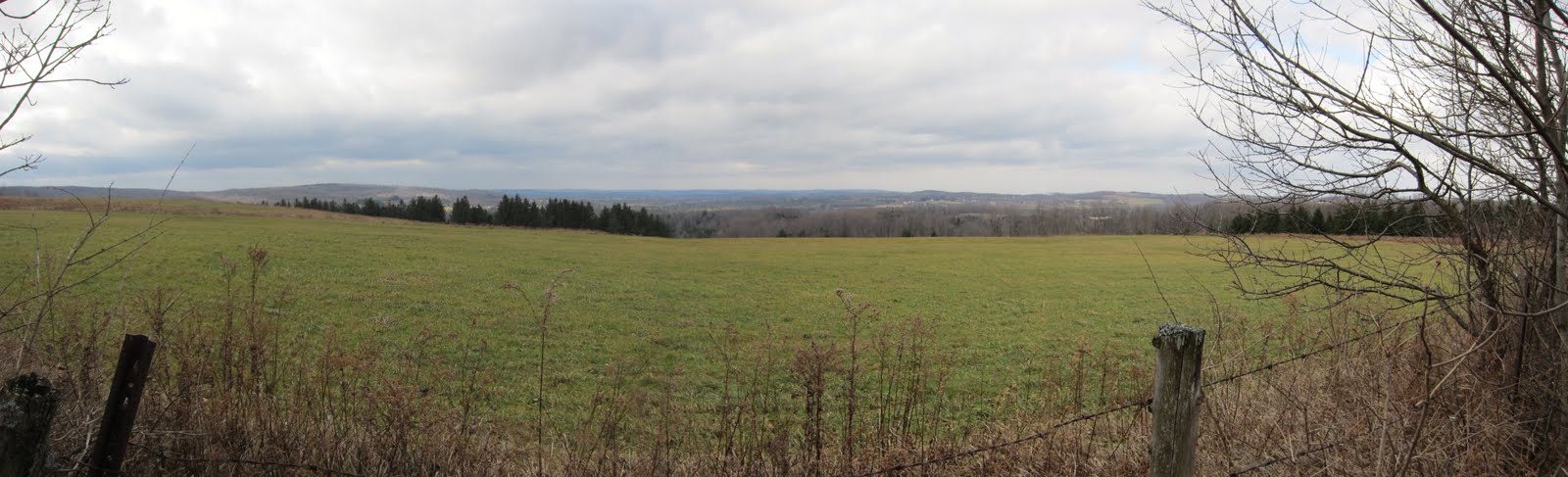 My folks started out with about forty acres and then purchased neighboring land until they owned around two hundred acres. This is the view from the fence line behind the house. The house sits at 2,200 feet on top of a ridge line halfway between Cazenovia and Hamilton (home of Colgate college) New York. Even enlarged it is hard to get an appreciation for the view but the distant horizon is about 30 miles away and in the winter the night lights of two local ski slopes can be seen about 20 miles away. This is looking west and there are pretty good sunsets. Nothing compared to those from the summit of Old Rag but probably better than 95% of the world gets to see on a daily basis.